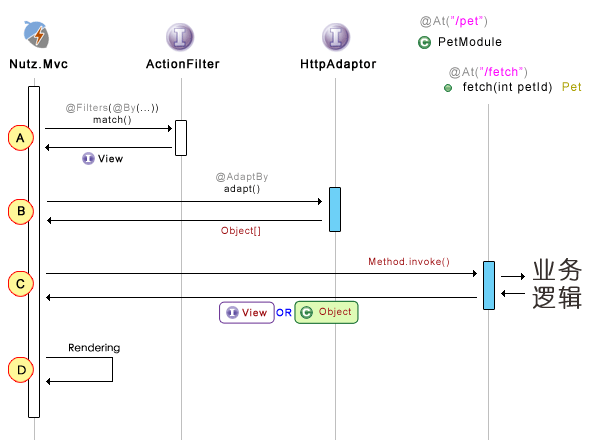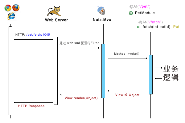 为了能让你更快速直观的了解 Nutz.Mvc 的工作方式,我提供下面两张图: