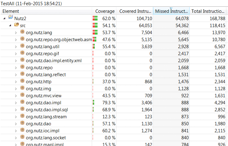 截至到现在为止,Nutz 的 JUnit 用例覆盖率大概是这样的